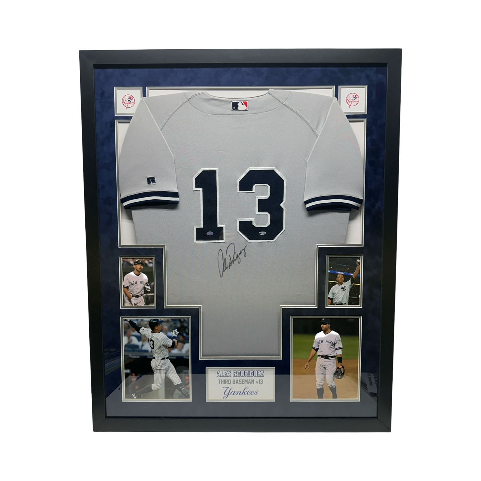 This is an framed jersey that has been hand signed by Alex Rodriguez. This item has been certified authentic by Professional Sports Authenticator (PSA) and comes with their tamper-proof sticker that can be verified on https://www.psacard.com.