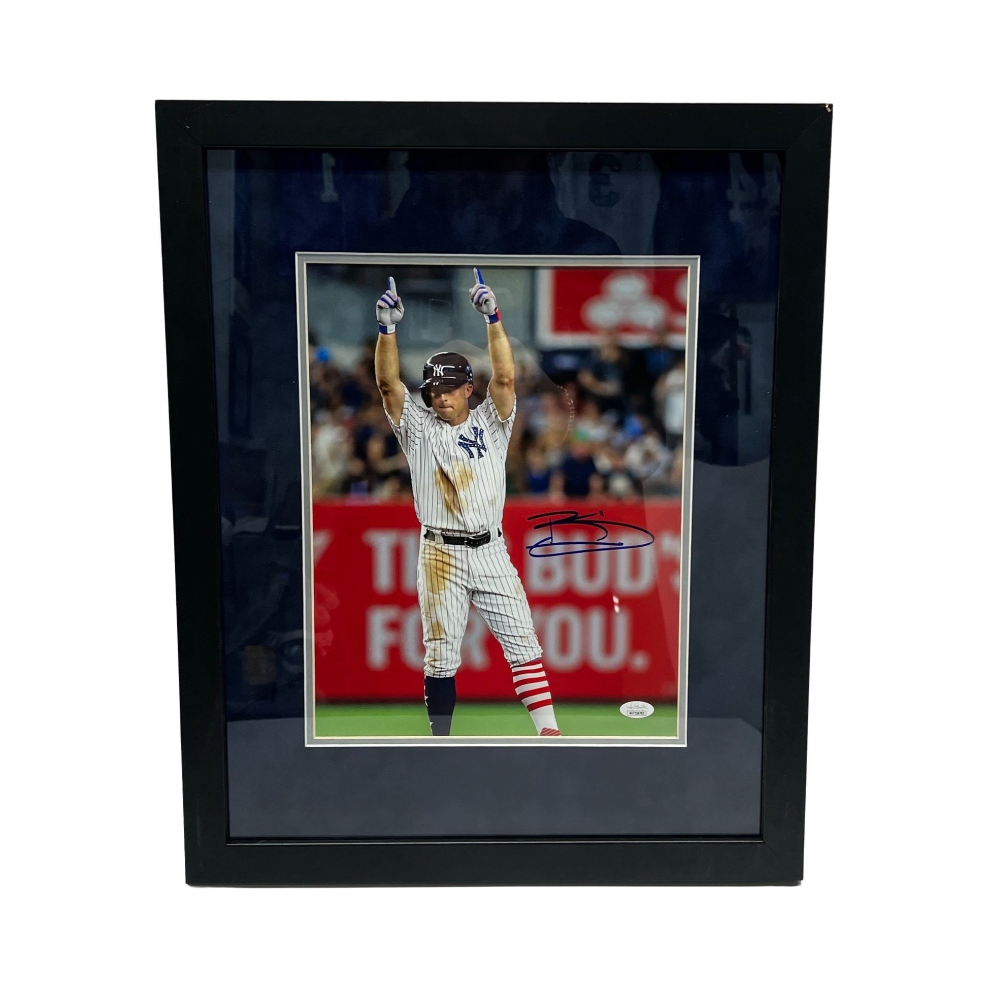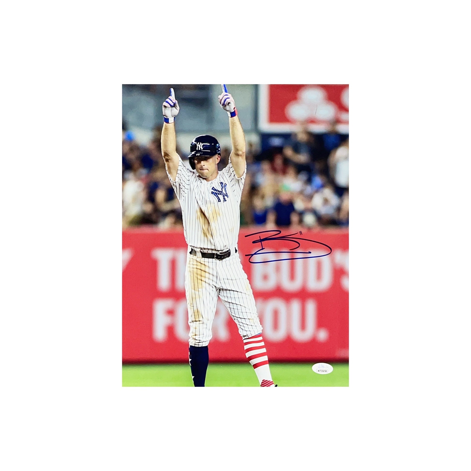 This is a 11x14 photo that has been hand signed by Brett Gardner. This item has been certified authentic by James Spence Authentication (JSA) and comes with their tamper-proof sticker that can be verified on https://www.spenceloa.com/