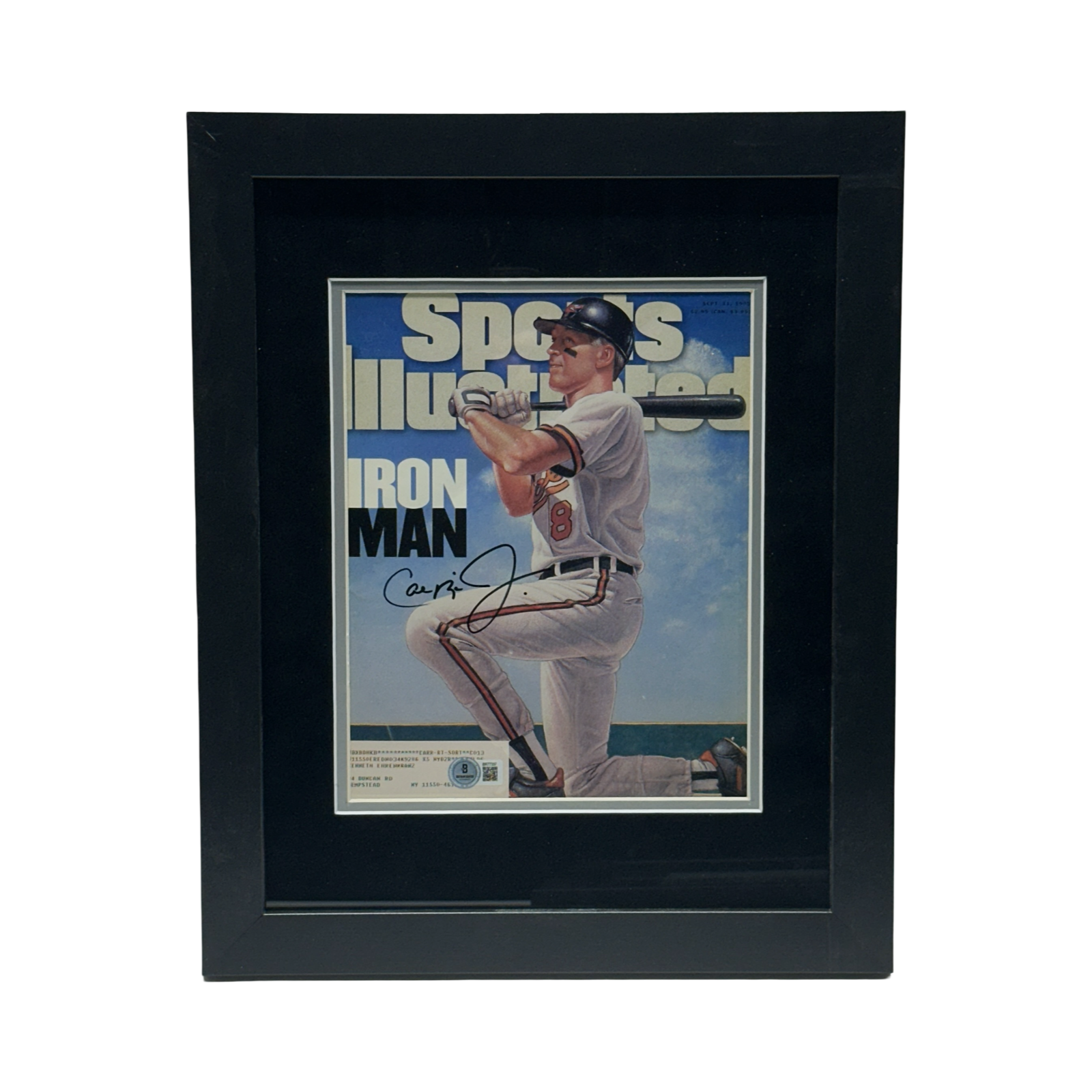 This is a framed 8x10 that has been hand signed by Cal Ripken Jr. This item has been certified authentic by Beckett Authentication (BAS) and comes with their tamper-proof QR Code sticker that can be verified on https://www.beckett-authentication.com.