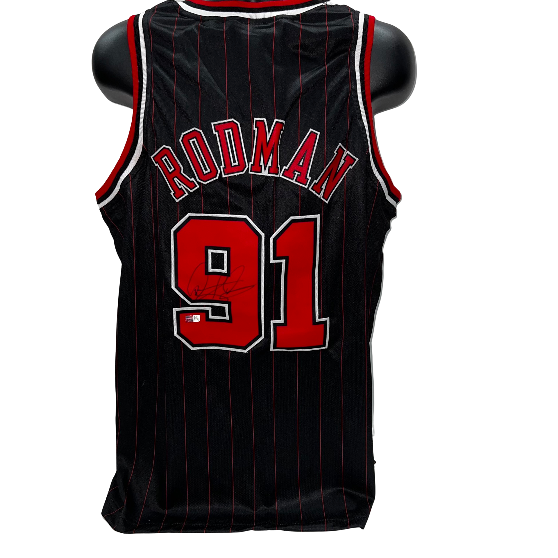 Dennis Rodman Autographed Chicago Bulls Black Pinstripe Jersey Steiner