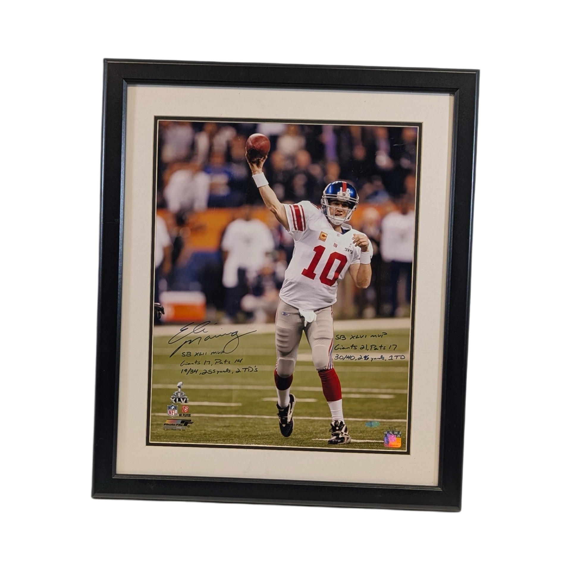 Eli Manning Autographed New York Giants Framed 16x20 "SB XLII MVP, GIANTS 17 PATS 14, 19/34, 255 YARDS, 2TDS" Inscriptions Steiner