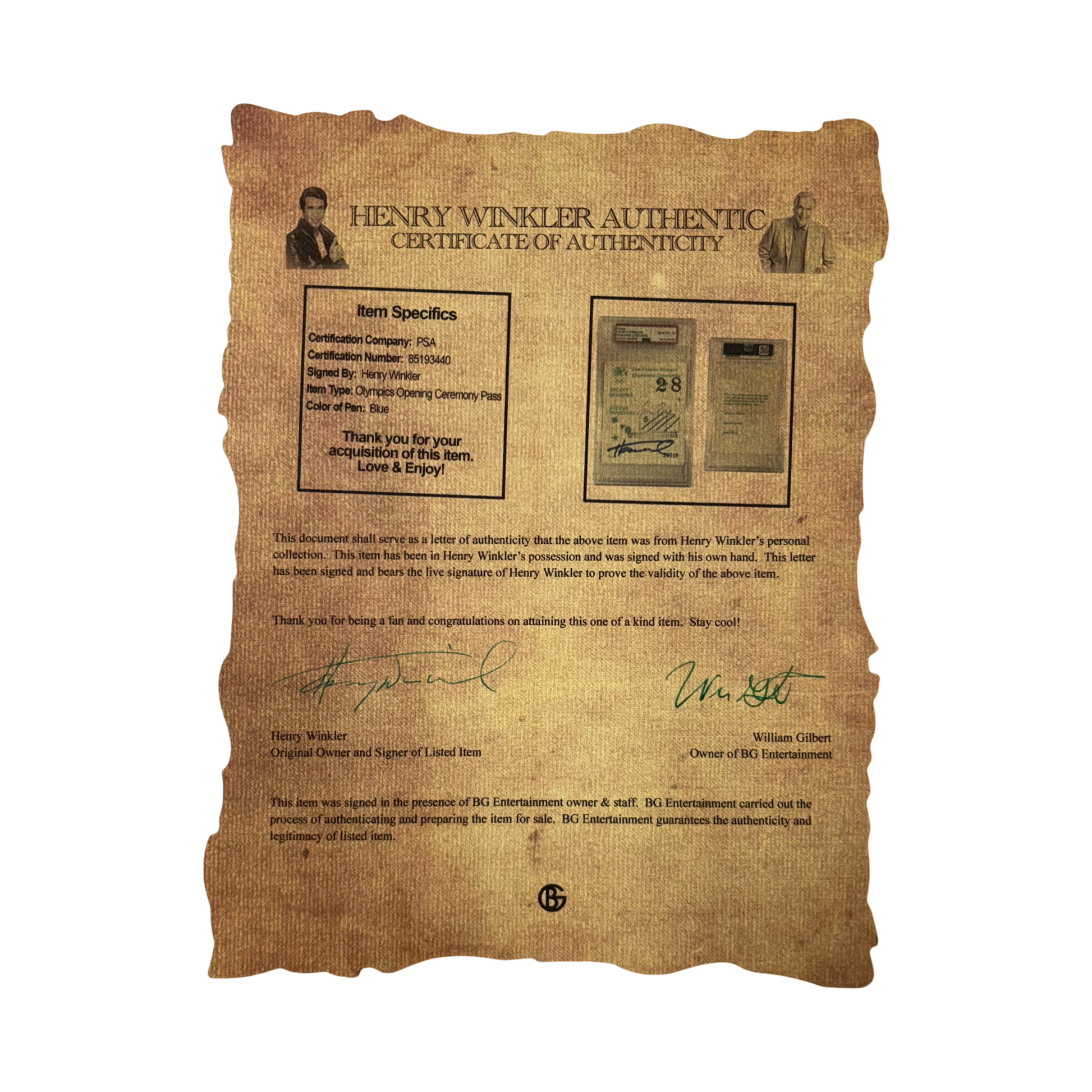 This item is a part of Henry Winkler’s personal collection, has been in his possession and was signed in his own hand. This item has been certified authentic and slabbed by Professional Sports Authenticator (PSA) and can be verified on https://www.psacard.com and also includes a letter of authenticity hand signed by Henry Winkler stating it’s authenticity to his collection.