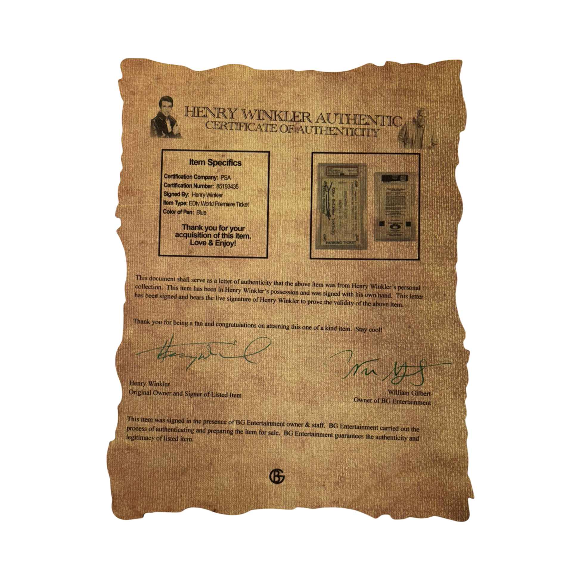 This item is a part of Henry Winkler’s personal collection, has been in his possession and was signed in his own hand. This item has been certified authentic and slabbed by Professional Sports Authenticator (PSA) and can be verified on https://www.psacard.com and also includes a letter of authenticity hand signed by Henry Winkler stating it’s authenticity to his collection.