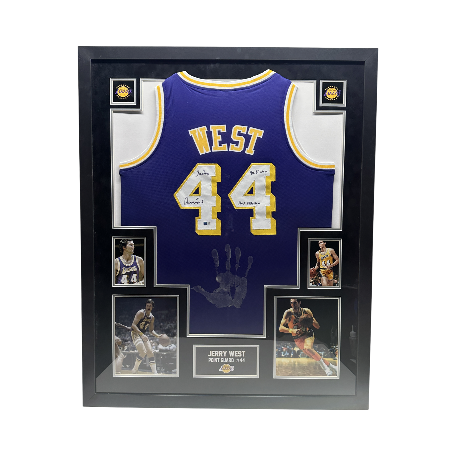 Jerry West Autographed Los Angeles Lakers Purple Jersey The Logo, Mr Clutch, HOF 1980-2010 Inscriptions with Handprint Steiner CX - Framed