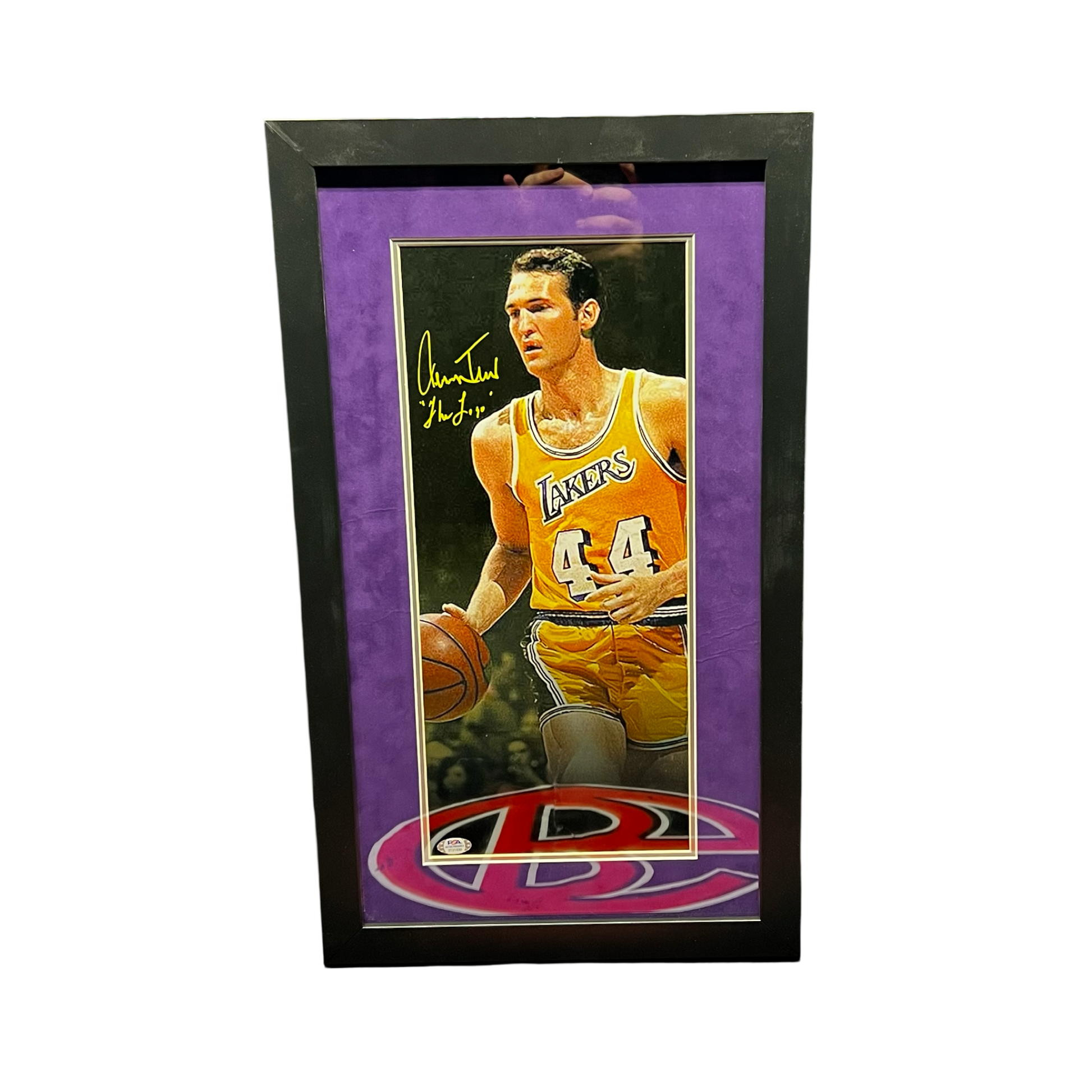 Jerry West Autographed Los Angeles Lakers Vertical Framed 8x18 The Logo Inscription PSA