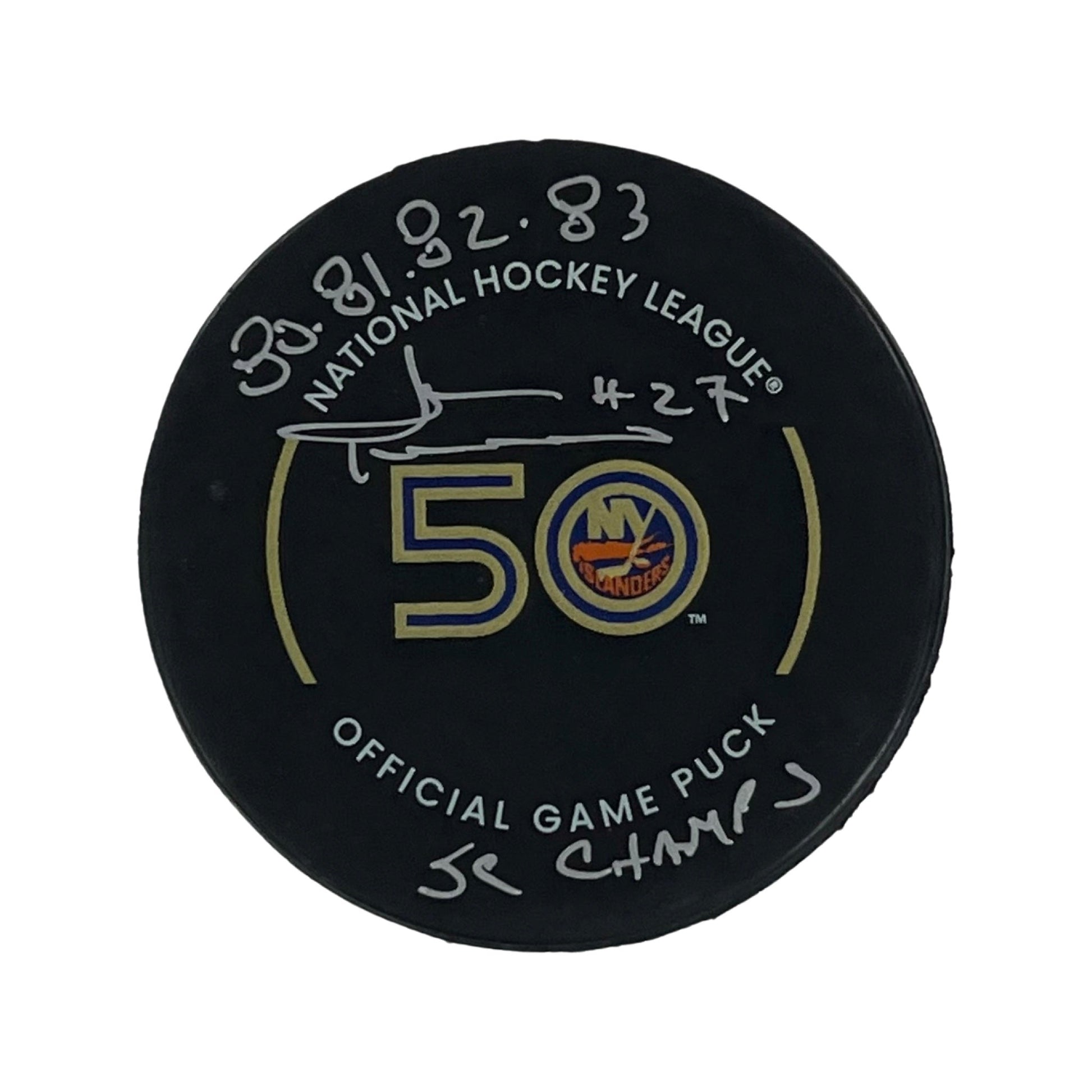 John Tonelli Autographed New York Islanders Official Game Puck 80 81 82 83 SC Champs Inscription Steiner CX