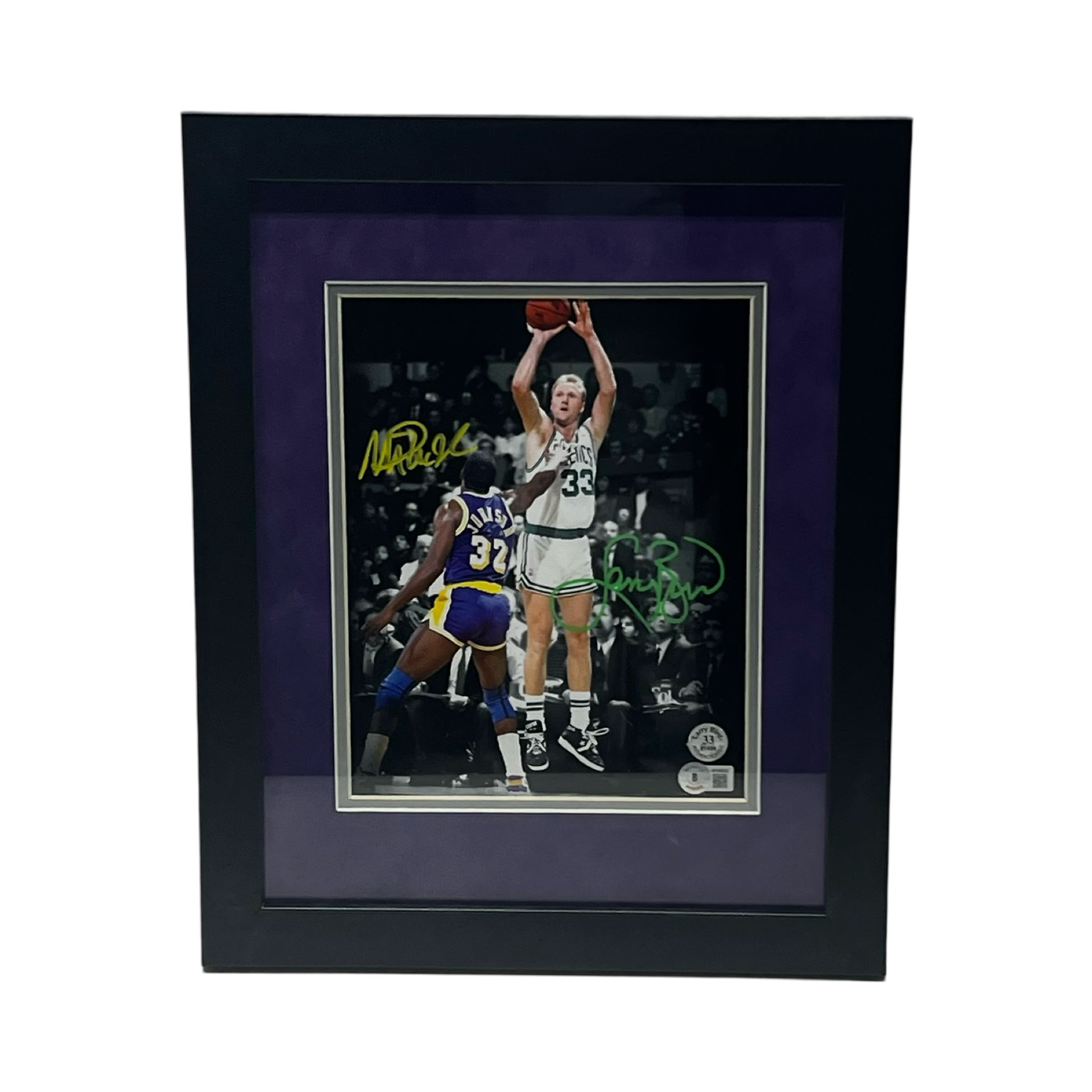 Larry Bird & Magic Johnson Autographed Boston Celtics & Los Angeles Lakers Spotlight 8x10 Beckett & Larry Bird COA - Frame W/ Purple Matte