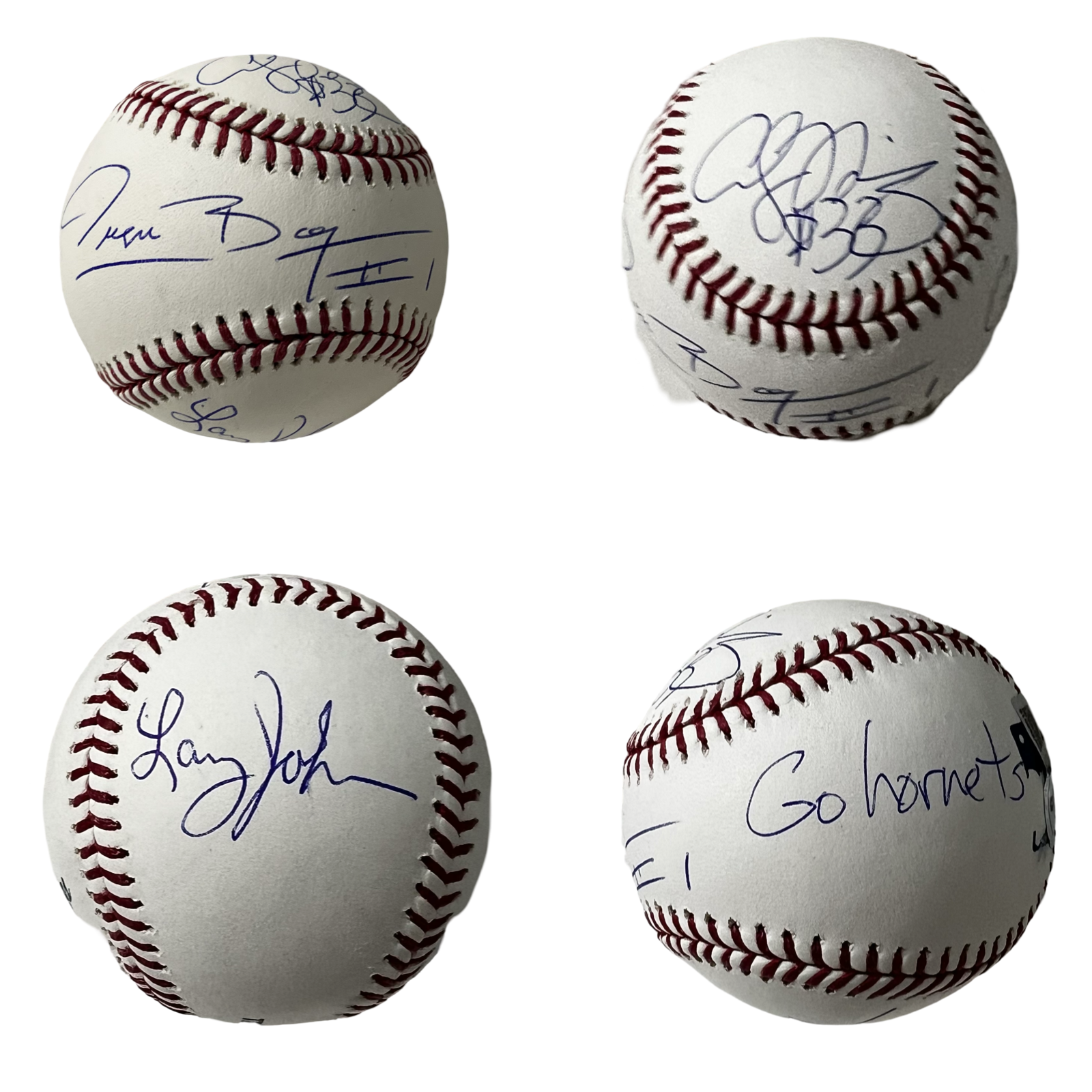 Larry Johnson, Muggsy Bogues, Alonzo Mourning Autographed Charlotte Hornets "GO HORNETS" Inscribed OMLB Steiner CX