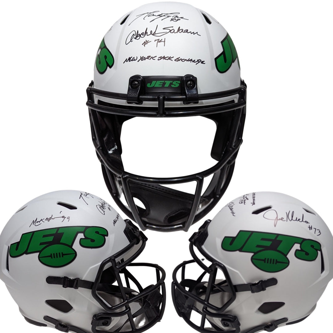 This is a Full Size Replica Helmet that has been hand signed by Mark Gastineau, Joe Klecko, Marty Lyons & Abdul Salaam. This item has been certified authentic by James Spence Authentication (JSA) and comes with their tamper-proof sticker that can be verified on https://www.spenceloa.com/verify-authenticity.
