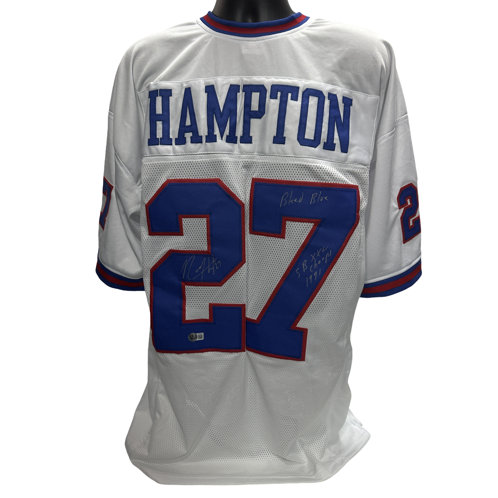 Rodney Hampton Autographed New York Giants "Bleed Blue, SB XXL Champs 1991" inscribed White Jersey Beckett BAS