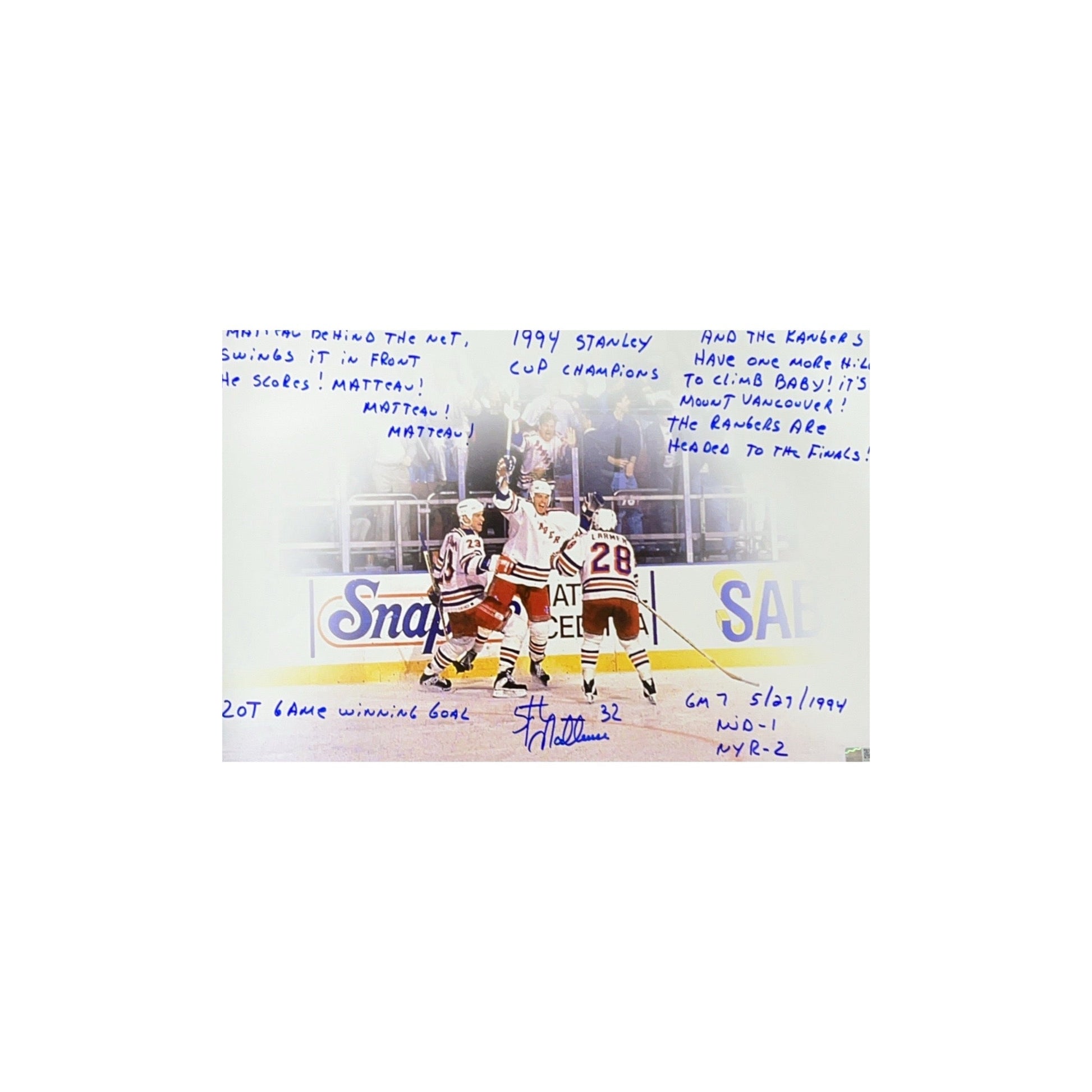 Stephane Matteau Autographed New York Rangers 12x18 "Final Goal Quote + 1994 Stanley Cup Champions, 20T Game Winning Goals, GM7 5/27/1994 NJD 1 NYR 2" Inscriptions Steiner CX