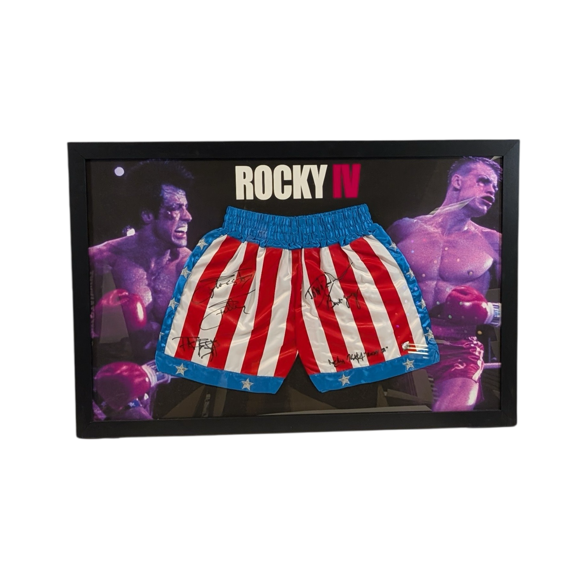 Sylvester Stallone, Shire & Cast Autographed Framed Trunks ASI Proof