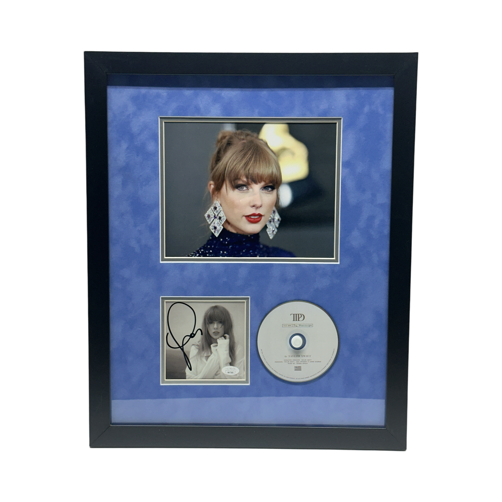 Taylor Swift Autographed Cut & Framed CD 11x14 Frame Headshot Big Earrings Light Baby Blue Matte Vertical JSA