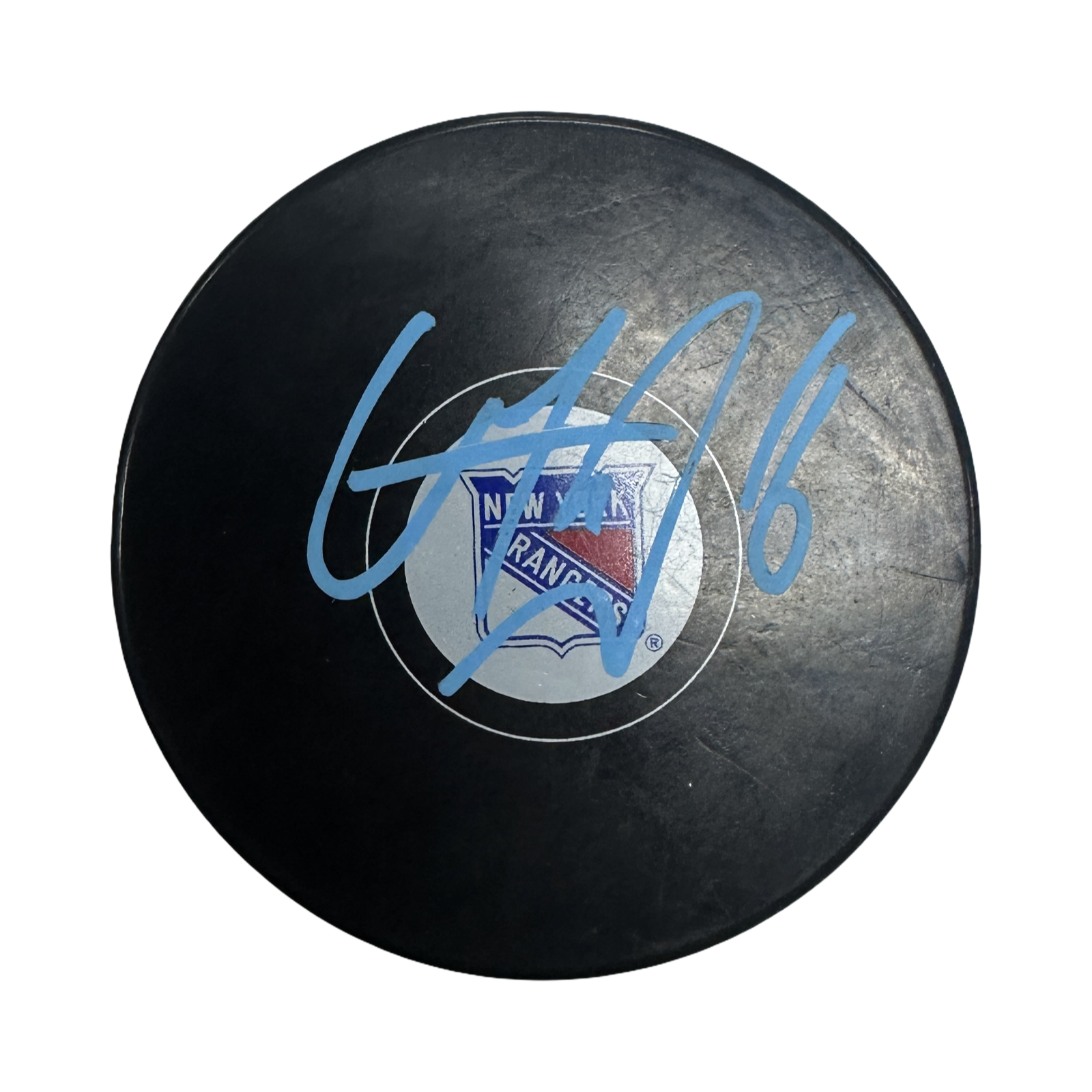 Vincent Trocheck Autographed New York Rangers Light Blue Ink Logo Puck JSA